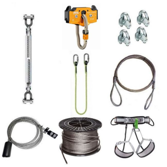 Please find below a list of items that you will find in the box. It's worth noting that you will receive two deliveries for your zip wire kit. 1x will be the wire and strop which is made and cut to order from our wire manufacturer in the West Midlands and 1x will be all the hardware for the kit which comes directly from The Zip Wire Company.